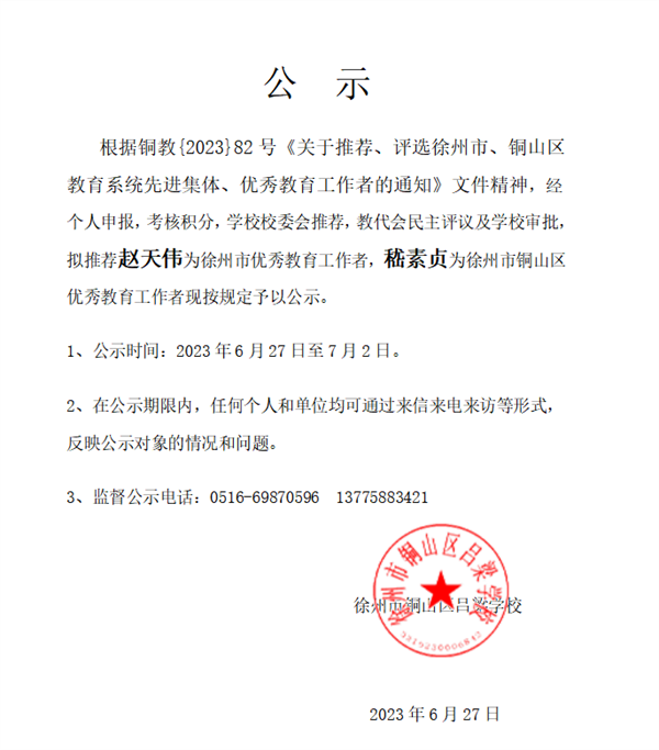 徐州市銅山區(qū)呂梁學校2023年評選市、區(qū)優(yōu)秀教育工作者公示