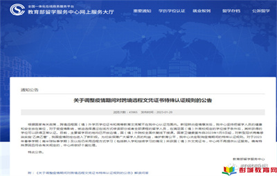 徐州教育:教育部留學(xué)服務(wù)中心發(fā)布公告,對(duì)于2023年春季學(xué)期(南半球秋季學(xué)期)及以后仍采用遠(yuǎn)程方式學(xué)習(xí)(包括新入學(xué)和繼續(xù)學(xué)習(xí)的情況)所獲國(guó)(境)外文憑證書,中心將不再提供認(rèn)證服務(wù)。具