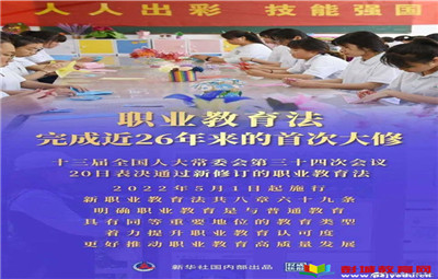 教育熱點(diǎn):十三屆全國人大常委會(huì)第三十四次會(huì)議4月20日表決通過新修訂的職業(yè)教育法,2022年5月1日起施行。新職業(yè)教育法明確職業(yè)教育是與普通教育具有同等重要地位的教育類型,著力提升職業(yè)教育