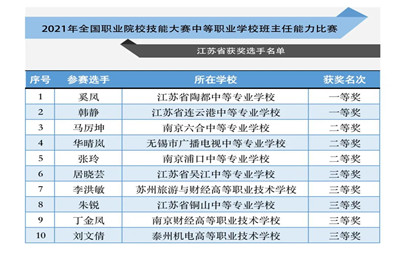 徐州教育:日前,教育部公布了2021年全國職業(yè)院校技能大賽中等職業(yè)學(xué)校班主任能力比賽獲獎(jiǎng)選手名單。江蘇省共有2位參賽老師榮獲一等獎(jiǎng)、3位參賽老師榮獲二等獎(jiǎng)和5位參賽老師榮獲三等獎(jiǎng)。