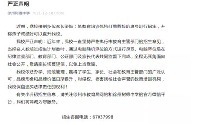 彭城教育:12月18日,徐州樹德中學微信公眾號發(fā)布:嚴正聲明