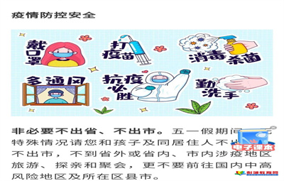 徐州教育:即將迎來“五一”假期,劉莊幼兒園為了廣大師生的安全,和深入貫徹落實市疫情防控指揮部文件要求,采取微信群,向廣大師生發(fā)出“五一假期安全教育”“疫情防控教育”,進(jìn)一步對師