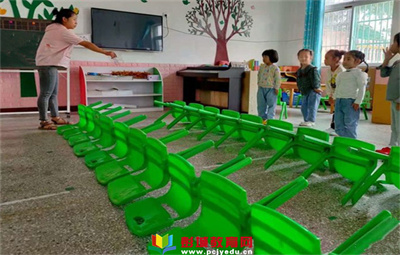 徐州教育:椅子是生活中常見的,容易獲取的教育資源。中一班用椅子作為游戲材料,設計了“扶椅子”游戲,讓幼兒去體驗常見的小椅子帶來的游戲樂趣?!胺鲆巫印边@個游戲是準備兩排小椅子,終