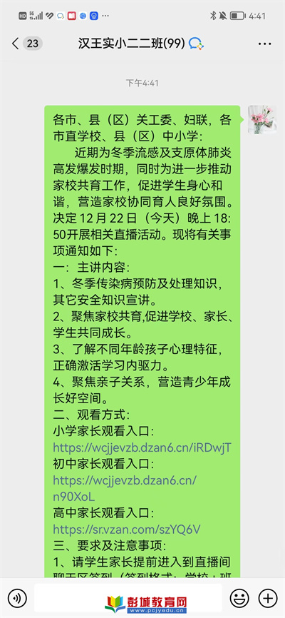 教育熱點:近期為冬季流感及支原體肺炎高發(fā)爆發(fā)時期,同時為進一步推動家校共育工作,促進學生身心和諧,營造家校協(xié)同育人良好氛圍。12月22日,漢王實驗小學組織全體家長觀看家庭教育公益直播