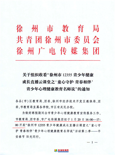 徐州教育:為做好春節(jié)期間青少年心理健康宣傳教育服務(wù)工作,共青團(tuán)徐州市委、徐州市教育局、徐州廣電傳媒集團(tuán)聯(lián)合發(fā)起“徐州市12355青少年健康成長直播云課堂之‘童心守護(hù)青春相伴’青少年心