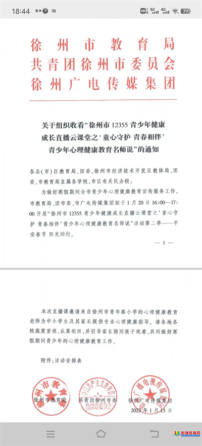 徐州教育:為做好寒假期間全市青少年心理健康教育宣傳服務(wù)工作,市教育局、團市委、市廣電傳媒集團擬于1月20日16:00-17:00開展"徐州市12355青少年健康成長直播云課堂之'童心守護青春相伴'青