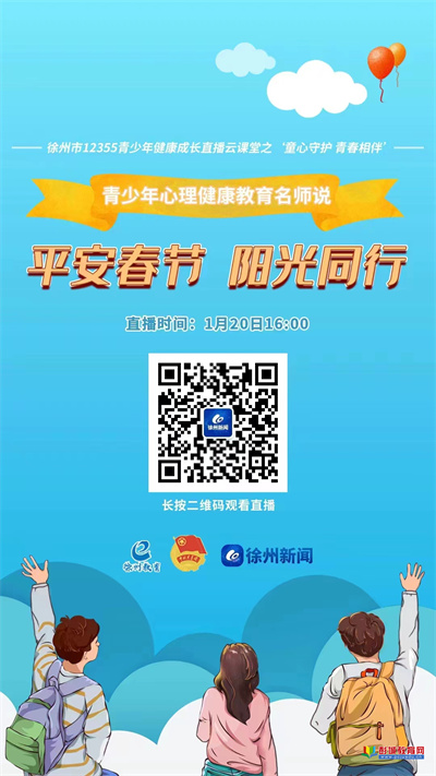 徐州教育:平安春節(jié),陽光同行。為做好寒假期間全市青少年心理健康教育宣傳服務(wù)工作,市教育局、團市委、市廣電傳媒集團于1月20日16:00-17:00開展“徐州市12355青少年健康成長直播云課堂之‘童心守