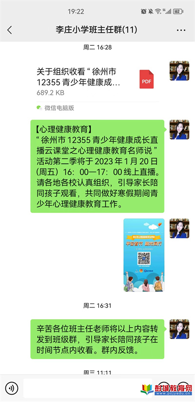 教育熱點:2023年1月20日下午4點,鄭集實驗小學(xué)西校區(qū)組織學(xué)生和家長收看徐州市12355青少年健康成長直播云課堂之“童心守護青春相伴”青少年心理健康教育名師說。授課專家是徐州市青年路小學(xué)教育