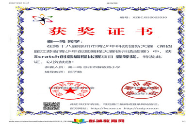 彭城教育:第十八屆徐州市青少年科技創(chuàng)新大賽(第四屆江蘇省青少年創(chuàng)意編程大賽徐州選拔賽)日前結(jié)束,徐州市解放路小學(xué)參賽選手發(fā)揮出色,在Scratch創(chuàng)意編程比賽項目中取得優(yōu)異成績。其中,朱