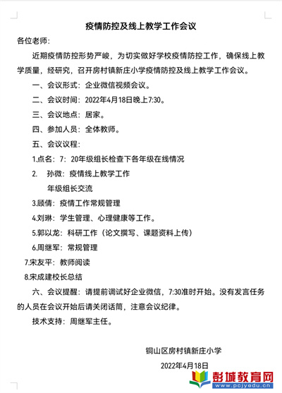 徐州教育:近期疫情防控形勢嚴(yán)峻,為切實(shí)做好學(xué)校疫情防控工作,確保線上教學(xué)質(zhì)量,有序開展學(xué)校各項(xiàng)工作,2022年4月18日,房村鎮(zhèn)新莊小學(xué)召開線上周前會,會議由宋友平副校長主持,全體教師利