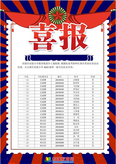 彭城教育:經(jīng)新區(qū)實(shí)驗(yàn)小學(xué)教育集團(tuán)少工委批準(zhǔn),根據(jù)隊(duì)前考核和紅領(lǐng)巾征章活動(dòng)結(jié)果,舉行2023-2024學(xué)年度入隊(duì)儀式,現(xiàn)公示新區(qū)實(shí)驗(yàn)小學(xué)2023級(jí)第一批次少先隊(duì)員名單,祝賀151名少先隊(duì)員成功加入少先