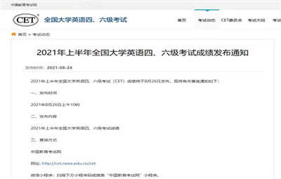 徐州教育:2021年上半年全國大學(xué)英語四、六級考試(CET)成績將于8月26日上午10時發(fā)布??忌傻顷懼袊逃荚嚲W(wǎng)站或“中國教育考試網(wǎng)”小程序查詢成績。